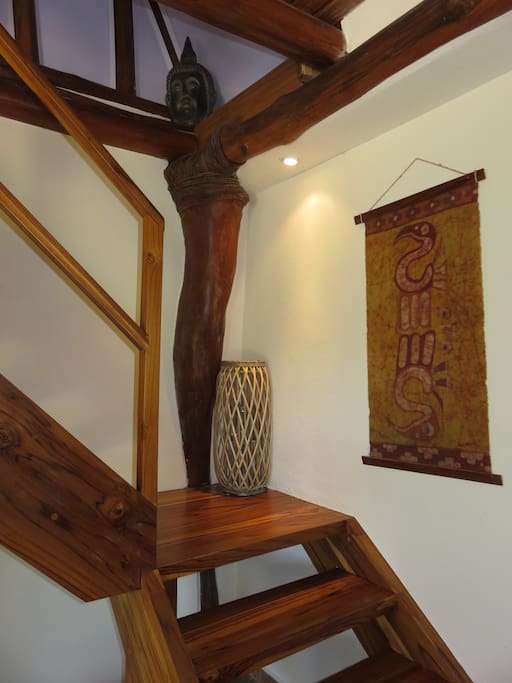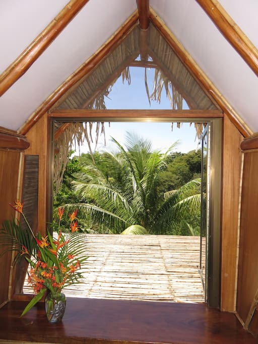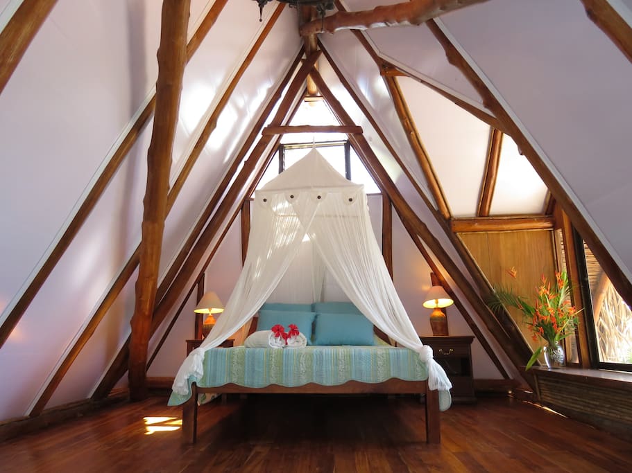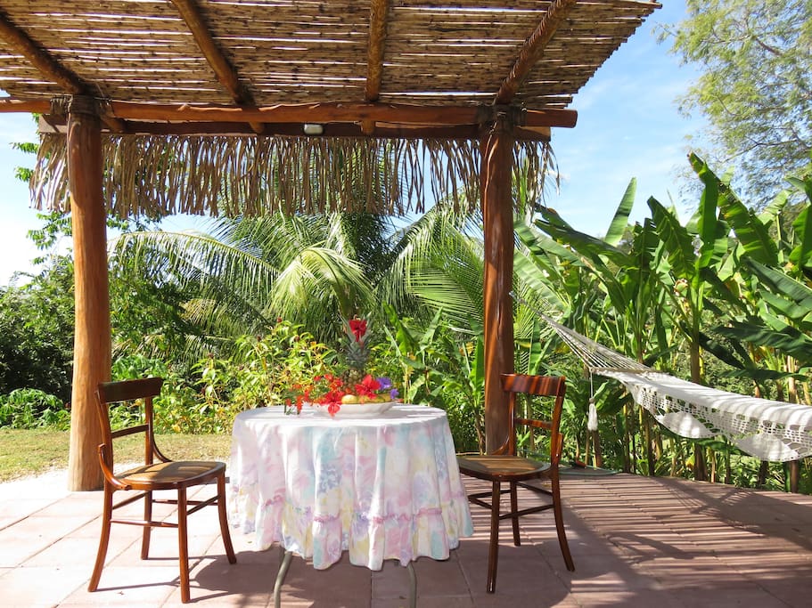 Entire bungalow with kitchen, bathroom, shower, master bedroom on 2nd floor (queen bed), living room with sofabed, covered terrace with table and hammock, garden bench, embraced by tropical gardens.
